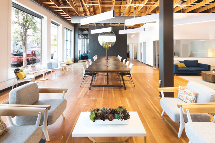 -Stylish-this is an industrial space with plenty of natural light and greenery, art by local artists, and a tech-equipped community table custom milled by a local artisan with lumber from a redwood tree that once grew on Mill Station Road.