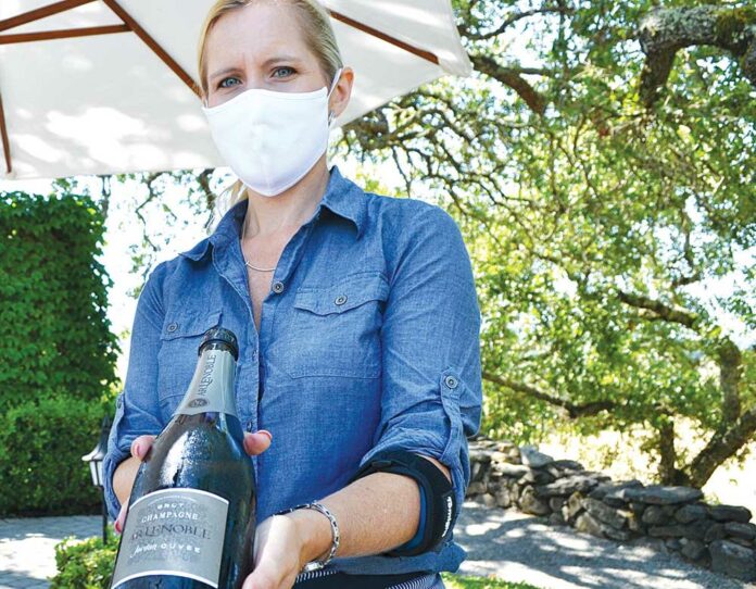 In between each seating, tables and chairs are sprayed and wiped down, and the kraft paper that covers picnic tables is changed. On a recent Sunday, groups of two to four adults stop by a table fronting the now-closed tasting room, to make their selection and choose a table. Food is not required here, but cheese and charcuterie plates are available, plus a pack of snacks and juice box for kids. Visitors, many from out of town, are generally quite respectful of the new rules, says Hagins, allowing that some tend to loosen up on their mask strings a little when leaving, after a glass or two of wine.