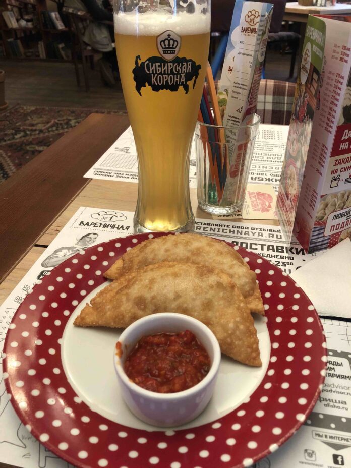 Do you enjoy the kitsch of a ’90s Applebee’s, the nostalgia of a ’50s diner and the Soviet Union? If so, then Varenichnaya No. 1 is the restaurant for you! The chain appeals to Russian adults who grew up in the late ’70s-early ’80s and now pine for the era’s simple comfort food. Surrounded by knick-knacks that included an old Soviet radio and television, I ordered a Sibirskaya (Siberian Crown) unfiltered lager and two pastry shells stuffed with minced lamb.